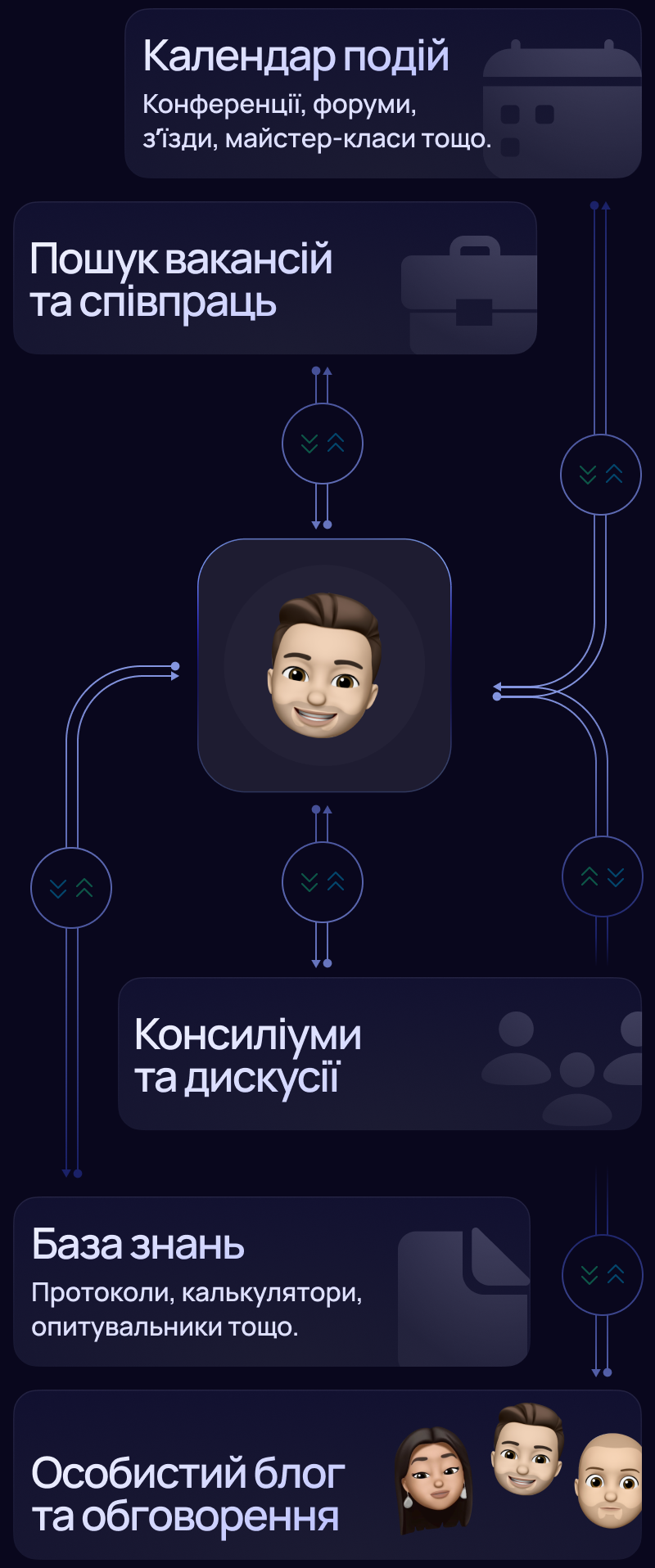 Ми спланували якісну комунікацію між лікарями як всередині однієї спеціальності, так і мультидисциплінарний нетворк. Спілкування, співпраця та результати всередині цілої екосистеми.